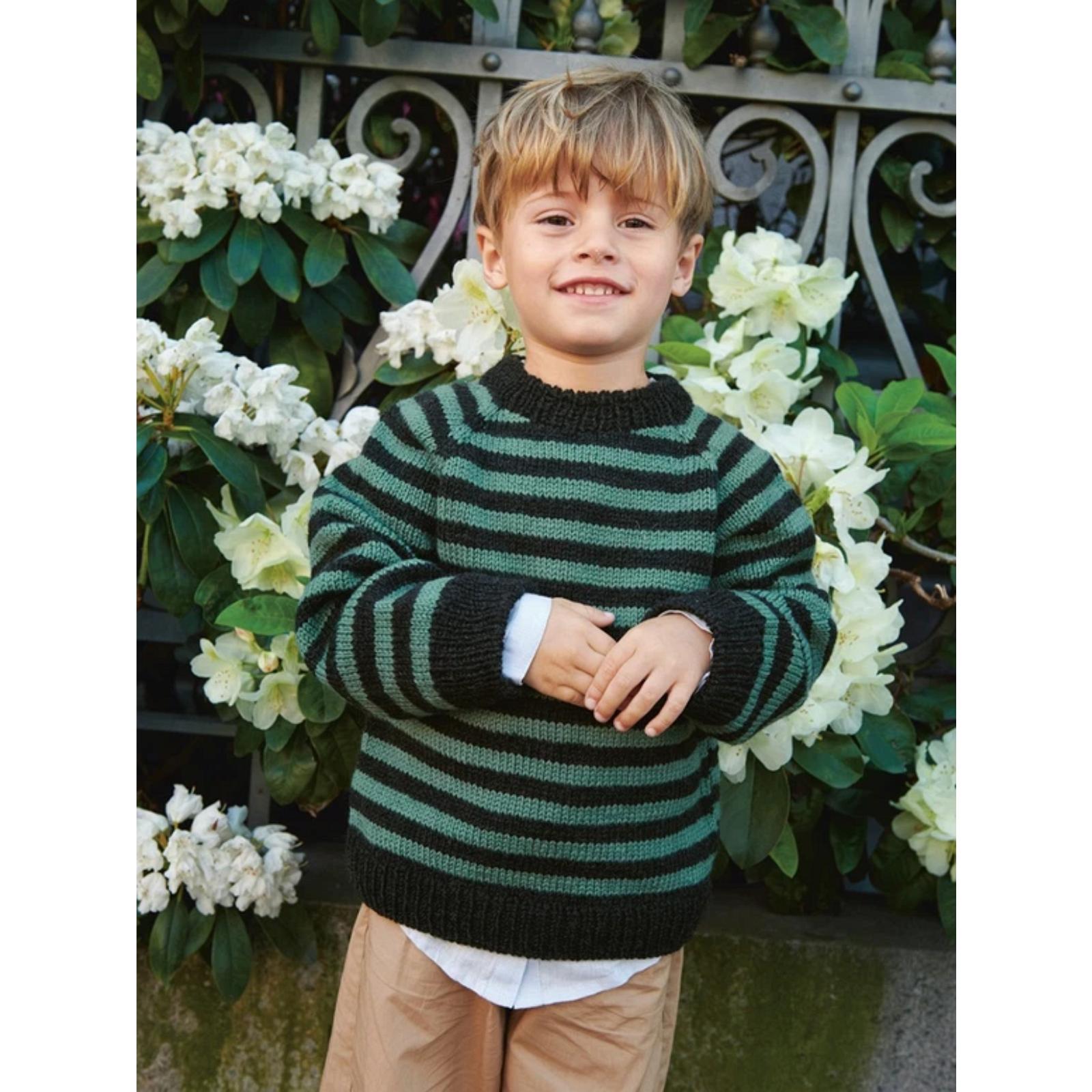 Der Pullover wird von oben nach unten mit Streifenmuster mit Double Sunday gestrickt.